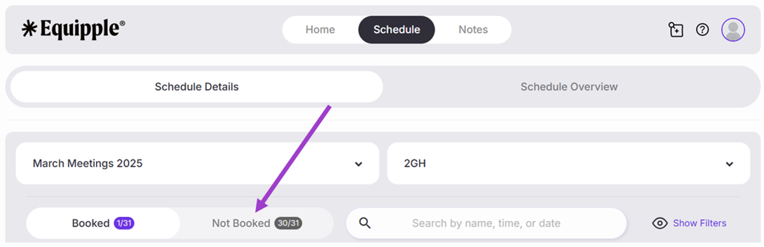 If you are at the stage where some meetings have been booked. Simply, click the 'Booked' tab instead. This will provide the same overview of information as clicking the 'Not Booked' tab, the only difference is one has booked a meeting, the other has not.