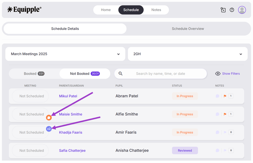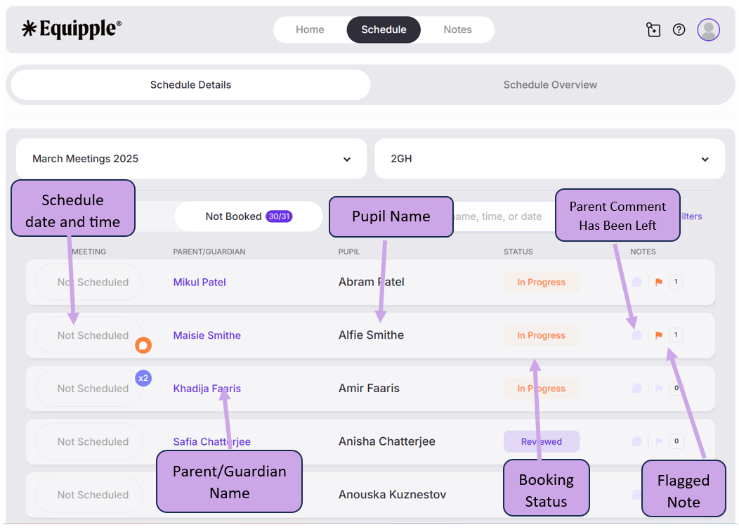 The Schedule tab is the place where you can find all of the upcoming meetings. This will display the up-to-date calendar of meeting bookings and it is a useful place to check the contact details of parents or guardians, as well as confirming which parent / guardian will receive the email invitation. If you are a ‘Class Teacher’ and want to have an overview and understanding of your scheduling page, follow these simple steps: