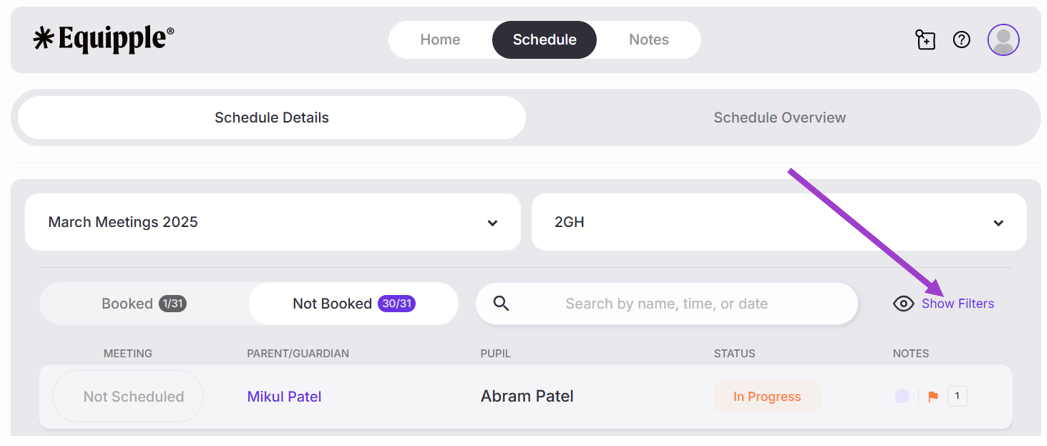 - If you want to filter the children in your class and have visibility over which specific children require an interpreter, require a double length meeting slot, have left a parent comment or you have flagged a note, then click ‘Show Filters’.