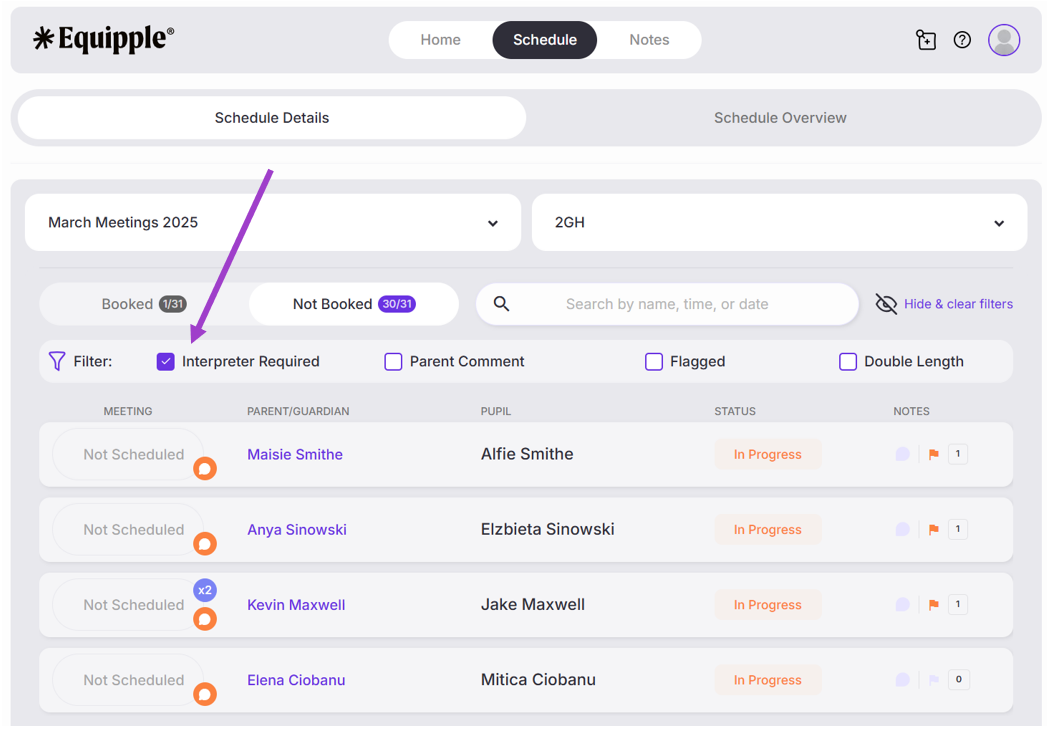 • A horizontal menu of filter choices will appear. Tick the box of the specific filter you would like to view. In this example, the ‘Interpreter Required’ filter has been selected. This now shows all the meetings in the class where an interpreter needs to be organised.