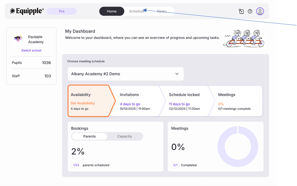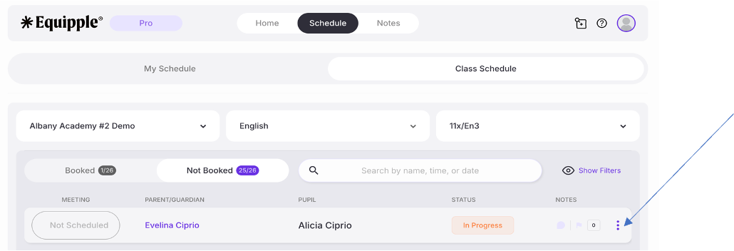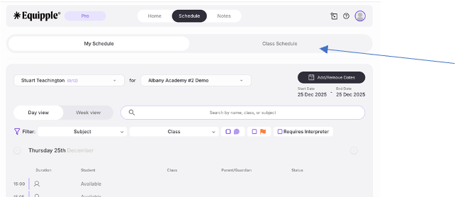 From the Equipple ‘Home Screen’, click the ‘Schedule’ tab. You’ll be taken to the ‘My Schedule’ page but please then select ‘Class Schedule.’ From here, click the drop-down menu and select the Parent-Teacher meeting schedule you are preparing for and double check your class is in the next tab.