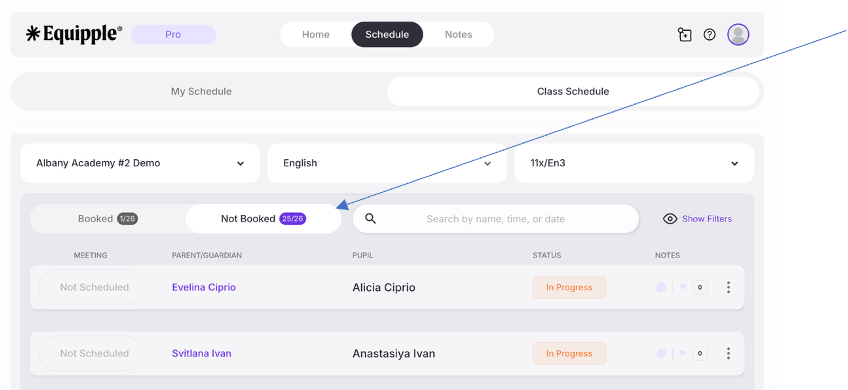 You’ll be taken to the ‘My Schedule’ page. From here, click on ‘Class Schedule’ and then select the Parent-Teacher meeting schedule you are preparing for. Finally, click on the ‘not booked’ tab to find the parent you would like to resend an invitation to.