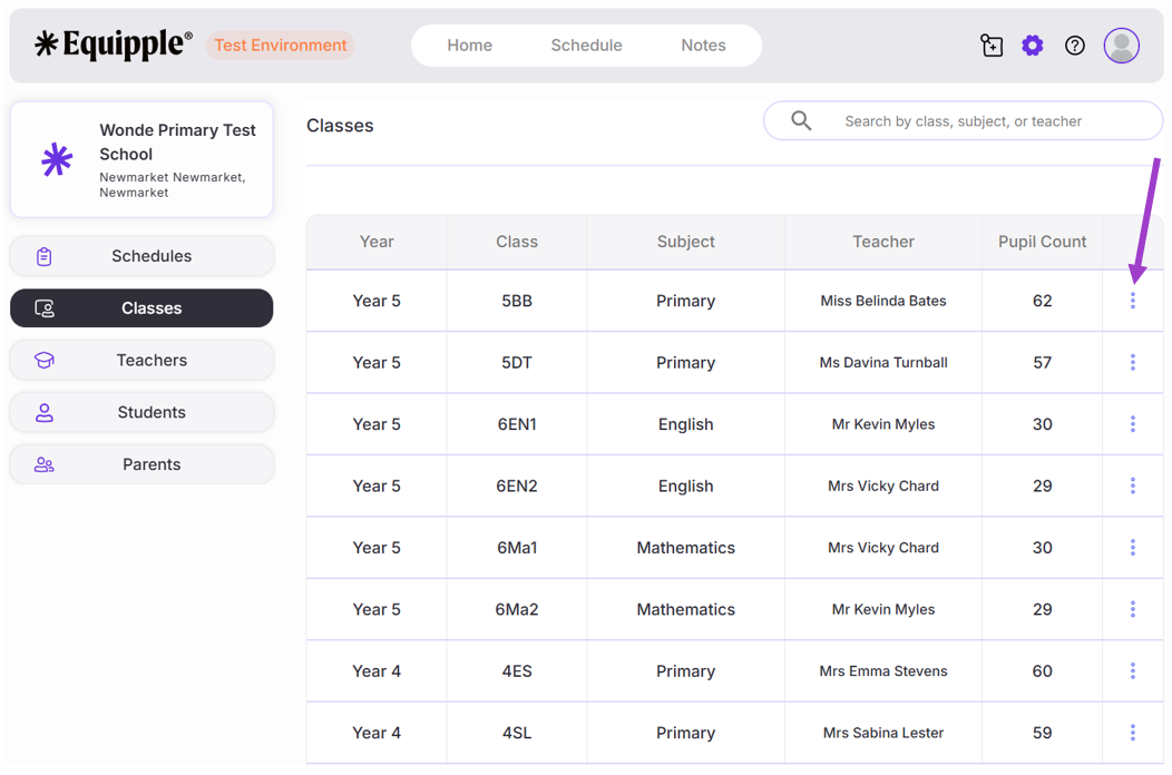 - To add a Teacher to a class, simply click on the ‘3 dot icon’ again next to the Class name.