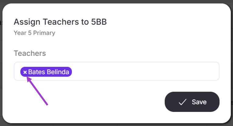 - To remove a teacher from that specific class, press the ‘x’ icon next to the name.