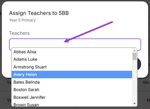- The pop-up tab will appear. Click on the ‘Teachers’ bar and a drop down menu will appear displaying all the staff on your Equipple account.