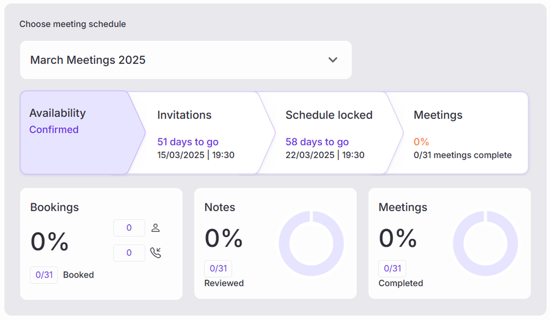 The Dashboard is the place where you can find much of the key information for your upcoming meetings. This will display information such as: