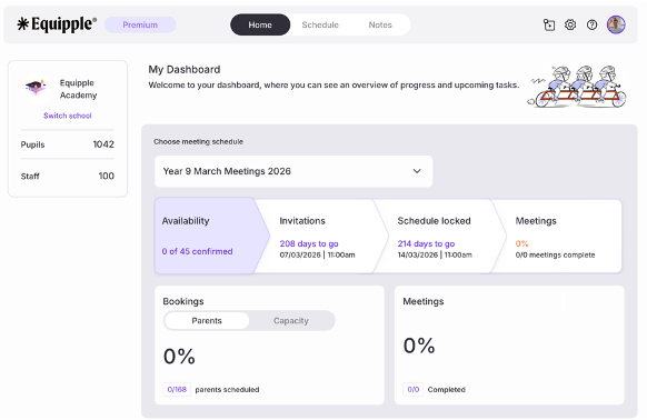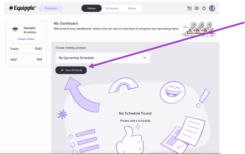 Nb. If you don't see the 'new schedule' button, this is likely because you are not set up as an administrator for your school. To get admin status, speak to someone in the school who is already an admin and they will be able to give you these privileges or email support@equipple.com and provide the name of your school as well as the rationale for requiring admin permissions.Step 1