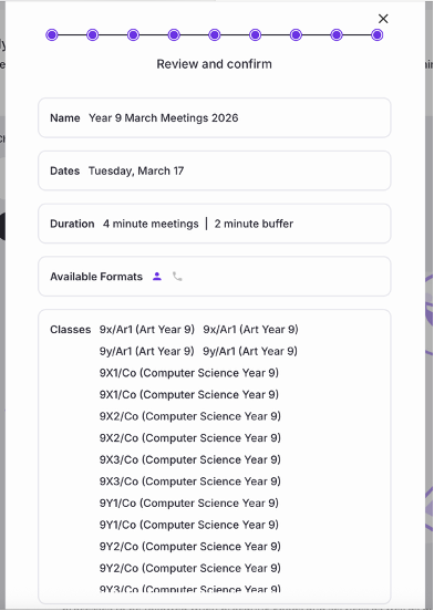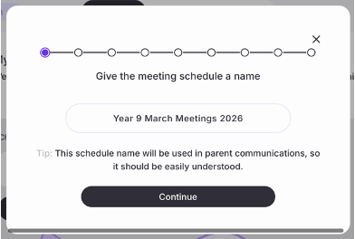 • This pop-up will appear which will ask you to ‘give the meeting schedule a name’. Choose something unique and specific to that set of parent/teacher Meetings. For example, ‘Year 9 March Meetings 2026’ and click ‘continue’.