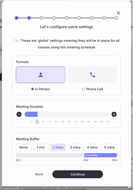 In this step you are simply setting the permissible formats. Teachers can choose to have fewer formats available for parents to book, but they cannot add additional formats.