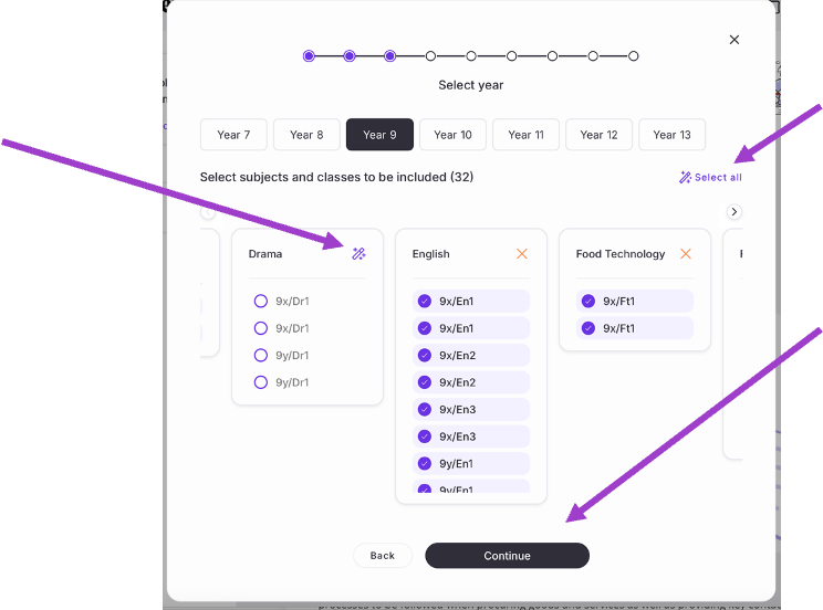 • Select which year groups and classes are taking part in the parent/teacher meetings. To save time and select multiple classes, you can click the ‘magic wand’ icon in the corner of each year group or ‘select all’ for your entire school. Click ’continue’.