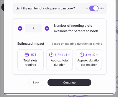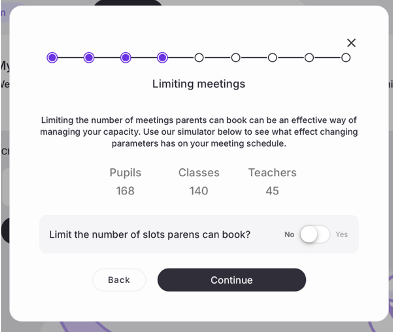 • You now have the facility to limit the amount of meetings that parents can book depending on the size of your school. This can be an effective way of managing the capacity of your staff. A popup will appear which tells you how many pupils, classes and teachers are associated in the meeting schedule that you have just created. If you would like to limit the amount of meetings that each parent can book select ‘yes’ toggle and then click ‘continue.’