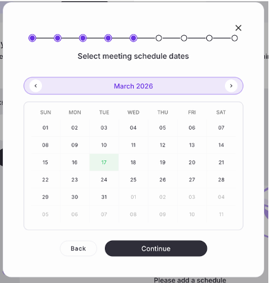 • A monthly calendar will now come up. Select the date or dates when your meetings are taking place. These will then be highlighted in green. Click ‘continue’.