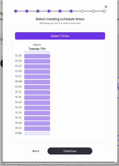 • You now need to select the exact times of your meetings. You can scroll up and down until you see the time slots you would like your school to conduct meetings. Click and hold on the earliest meeting slot for the first day and drag down until the final slot. You can leave gaps by clicking on a specific time slot. Double check your timings and click ‘continue’.