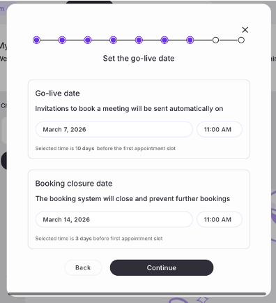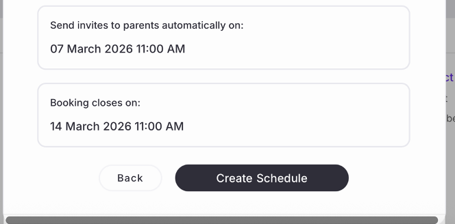 • This page tells you when parents will automatically receive their invitations and also when the booking window for parents closes. We recommend that you open the booking window 10 days before the meetings to allow teachers time to prepare and parents time to choose their slot but you can alter this and select the specific date and time manually that you would prefer.