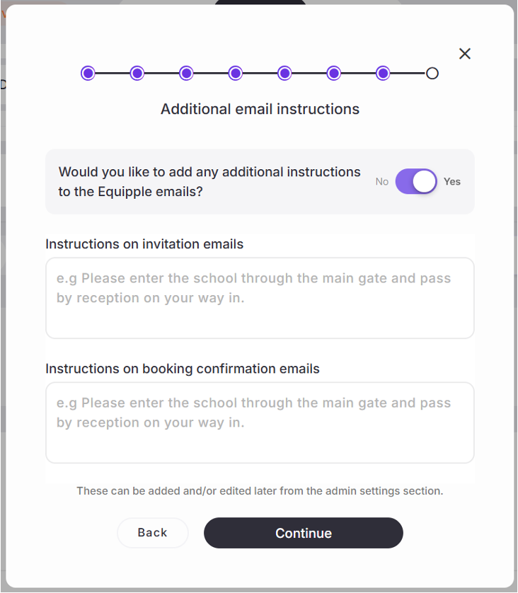 • You now need to decide if you would like to add any additional instructions for parents to view when they receive their Equipple email. This might be instructions for parking on the day of the meetings, which entrance of the school to use, where parents should wait etc.