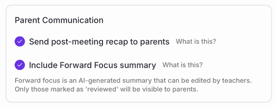 • Finally there is the option to send parent communication following the meetings. If you would like to automatically send parents a follow up report which can include assessment data, attendance and even an AI-Generated summary for parents you can select either of these options. There is a short descriptor beside each option to let you know what it means.
