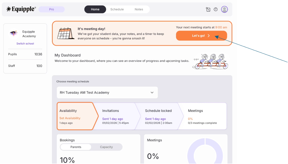 - When you sign into Equipple on the day of your meeting you will see an orange banner alerting you that it is the day of your upcoming meeting. Click ‘Let’s Go’ to take you to your first meeting.
