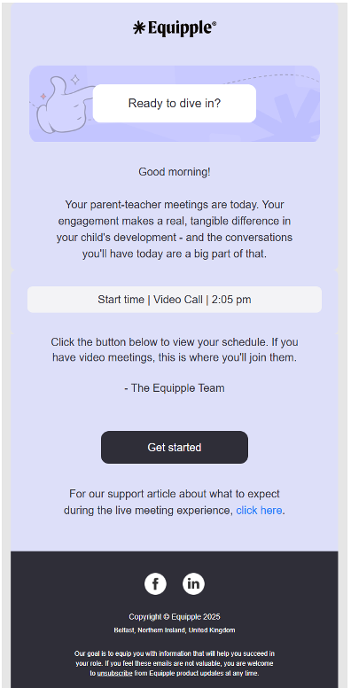- On the day of your meeting you will receive an email from Equipple which looks like this: